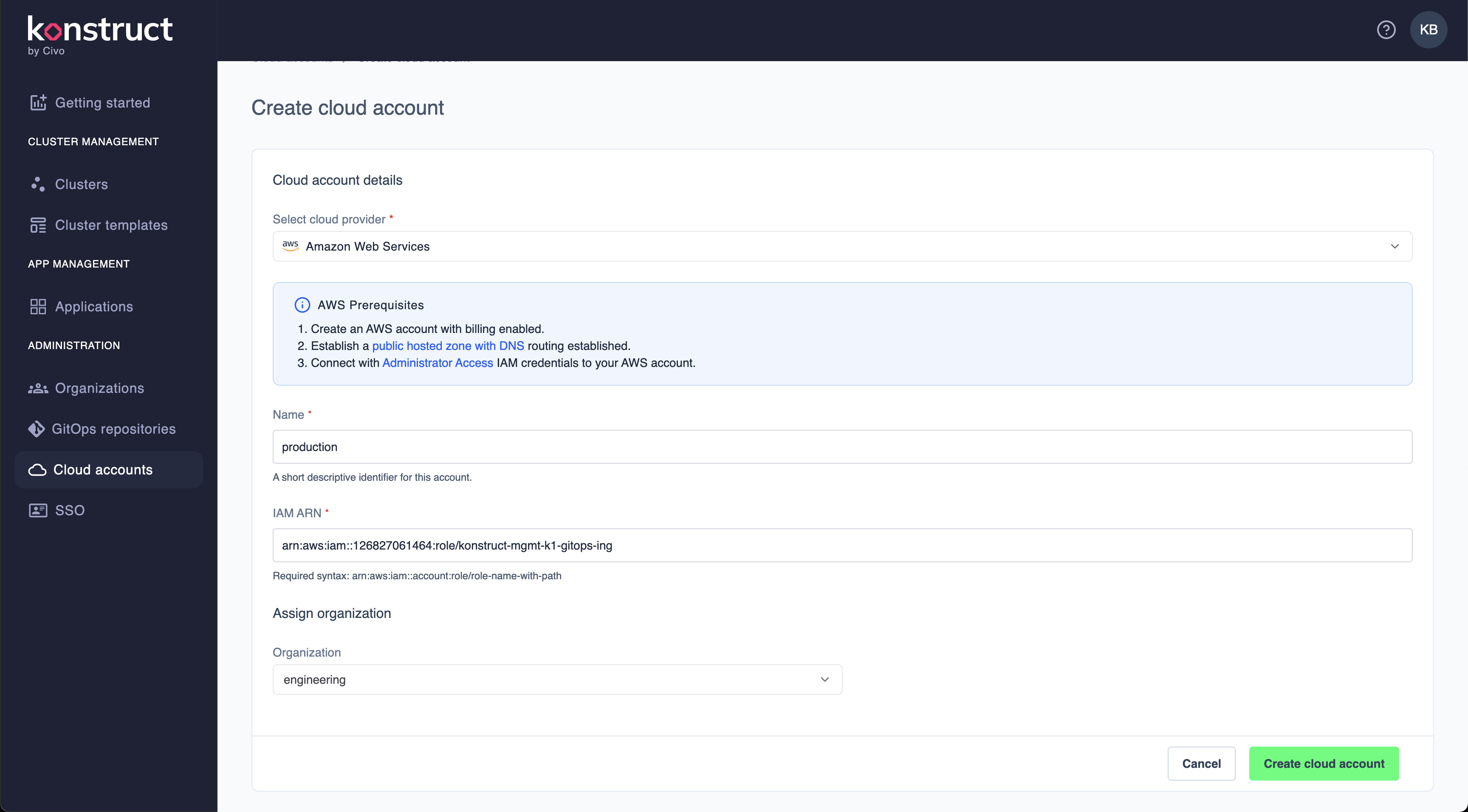 Give your cloud account a name and the Role ARN to assume. For more information on creating an assumable teamcluster role, please see
