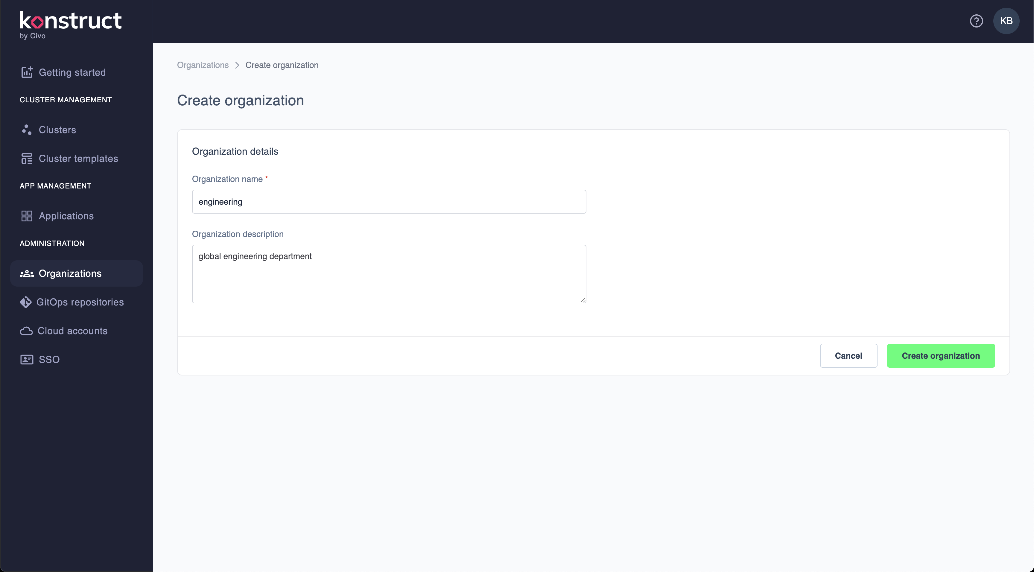 Members of the Platform Admin role are able to create a Konstruct Organization. Navigate to Organizations and click the Create Organization button in the top right corner.