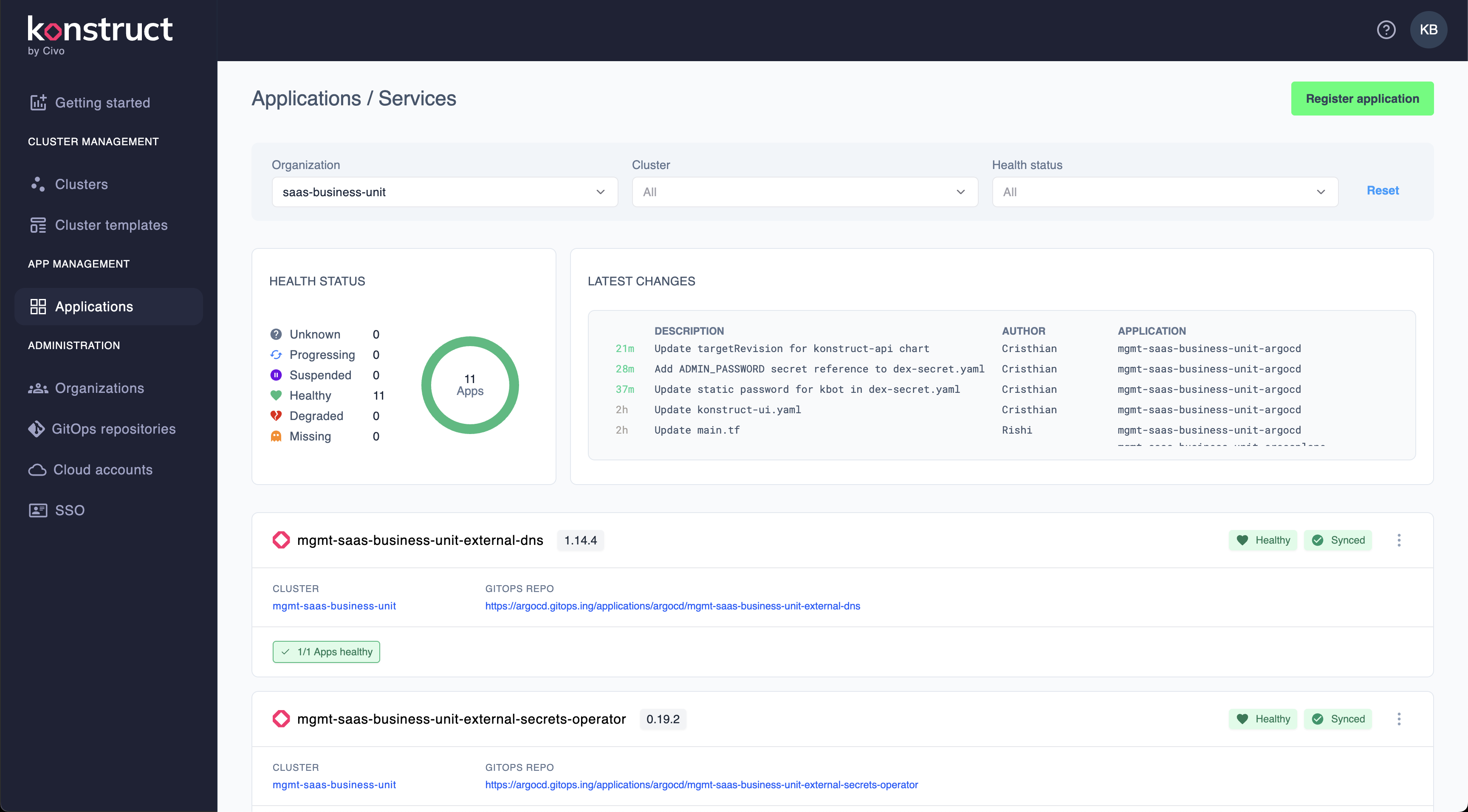 As you add gitops applications to your Konstruct platform, this page will dynamically adjust to present you with important information about the health and configuration of the applications that are built and delivered to your clusters.