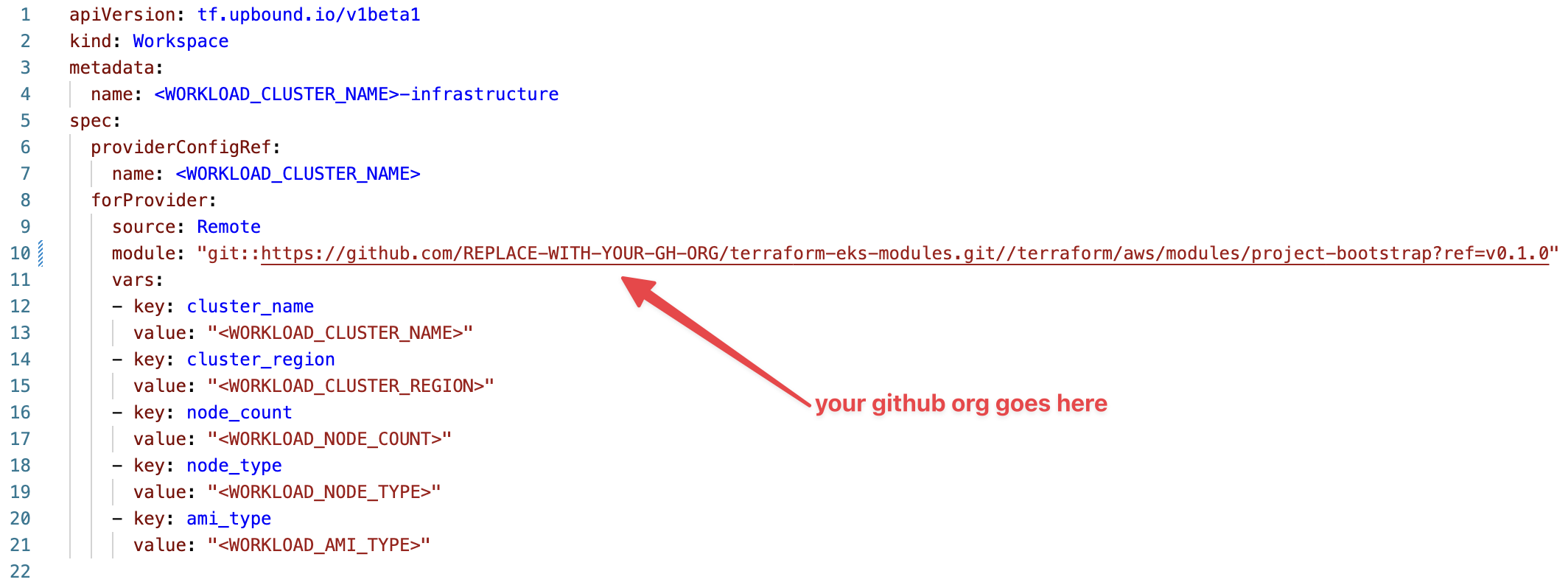 Navigate to your konstruct-repo's file located at templates/workload-downstream-cluster/infrastructure/workspace.yaml. This is your workload cluster template for physical EKS clusters. Let's change update its module to your new remote module as shown here.
