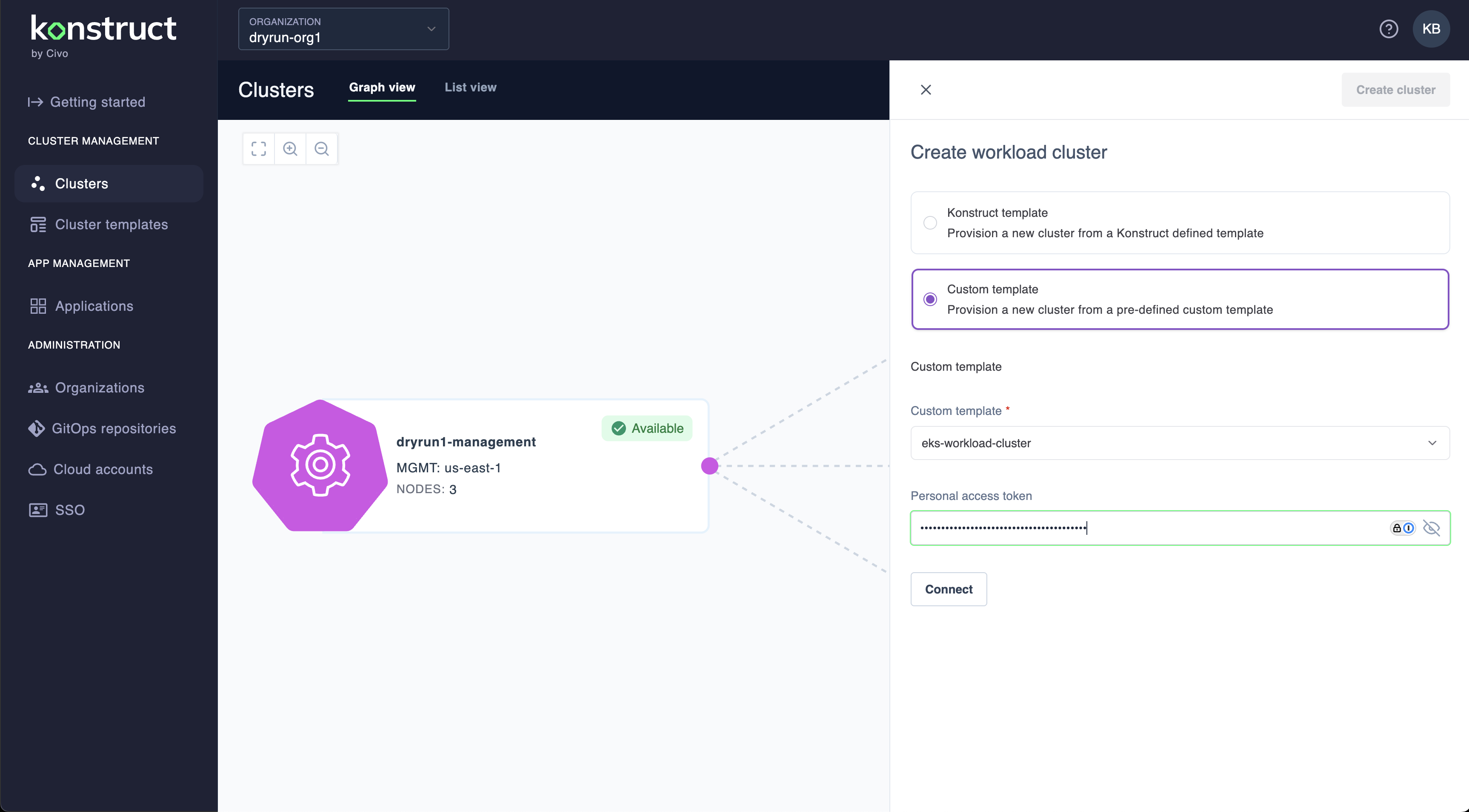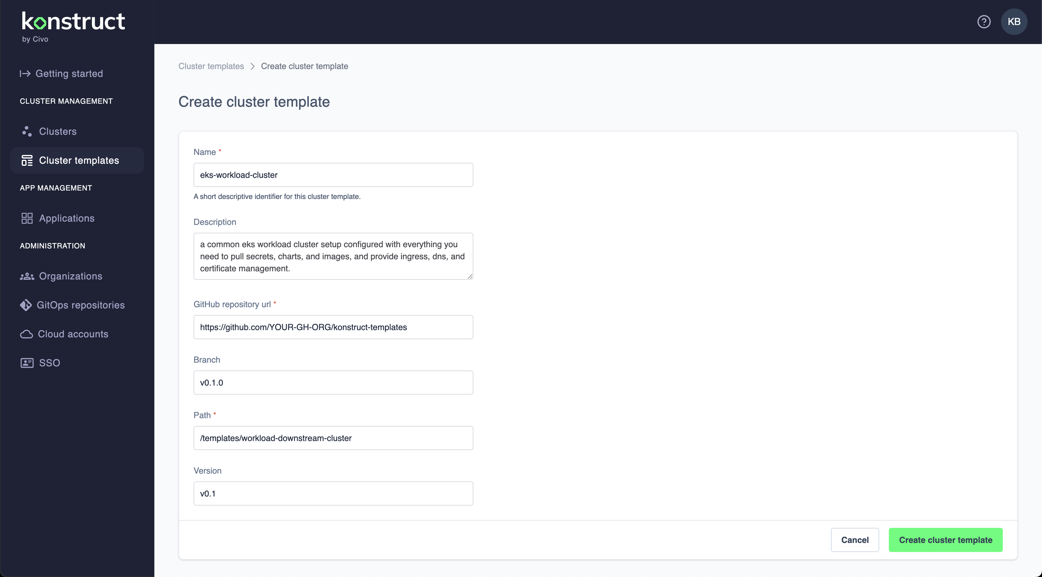 Now that you've created your own cluster template, let's navigate to the Cluster Templates section of your Konstruct instance to register it with the platform.