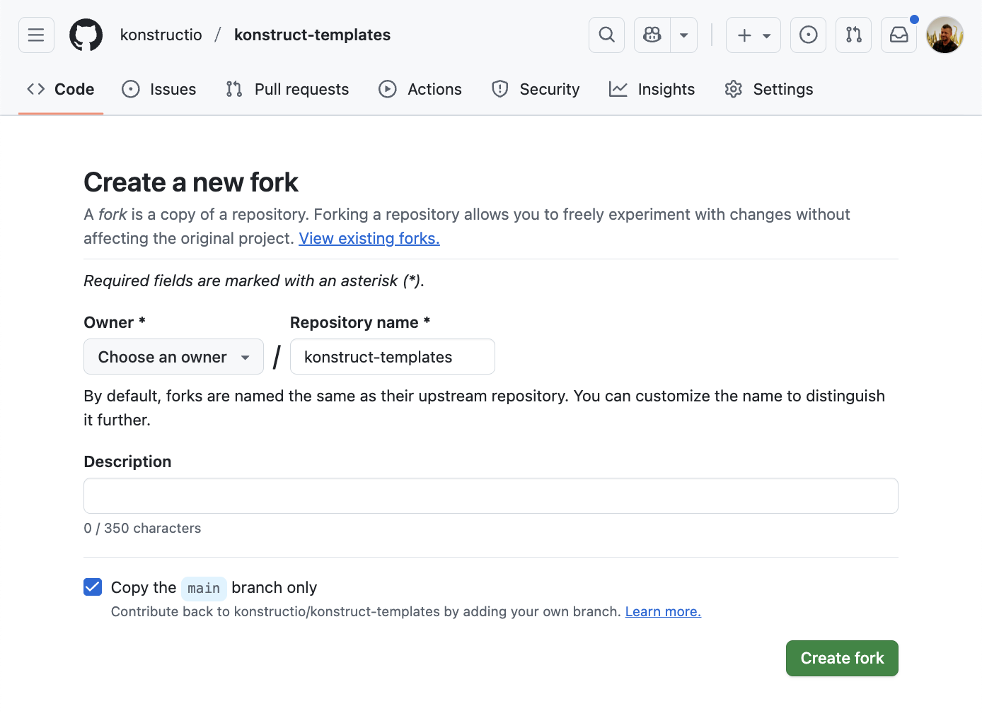 The fastest way to create a custom templates is to start from ours. Fork our konstruct-templates repo into your organization or personal account.